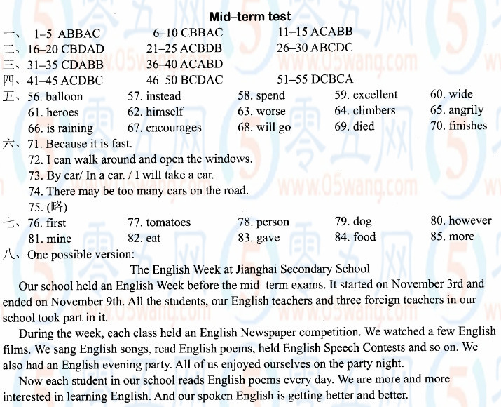 初二八年級上冊英語Midterm test學(xué)習(xí)與評價答案