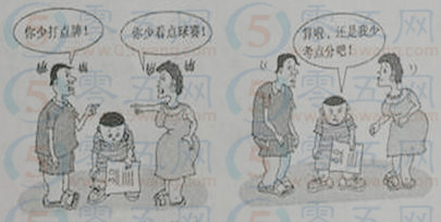 14.父親希望孩子有一個快樂健康的童年,(2分)母親怕孩子輸在起跑線上,要把孩子帶進(jìn)現(xiàn)實。(2分)