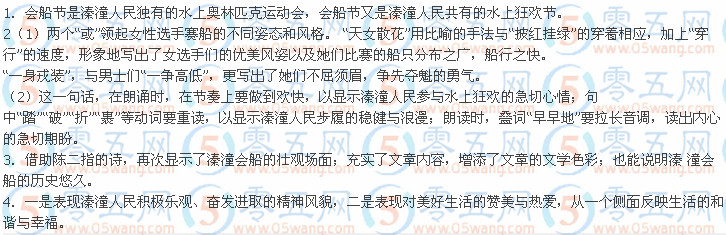 3.借助陳二指的詩,再次顯示了溱潼會船的壯觀場面;充實(shí)了文章內(nèi)容,增添了文章的文學(xué)色彩;也能說明溱 潼會船的歷史悠久。