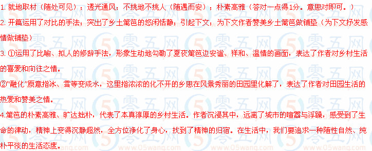 1. 就地取材(隨處可見);透光通風(fēng);不挑地不挑人(隨遇而安);樸素高雅(答對(duì)一點(diǎn)得1分。意思對(duì)即可。)