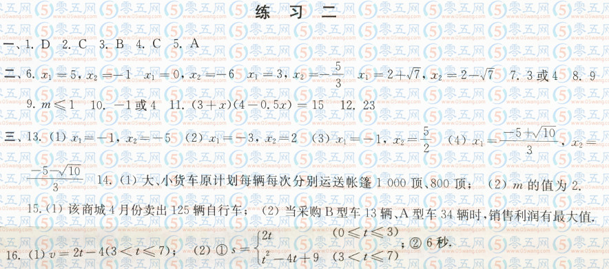 初中九年級(jí)寒假學(xué)習(xí)生活數(shù)學(xué)練習(xí)二答案