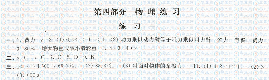初中九年級寒假學習生活物理練習一答案
