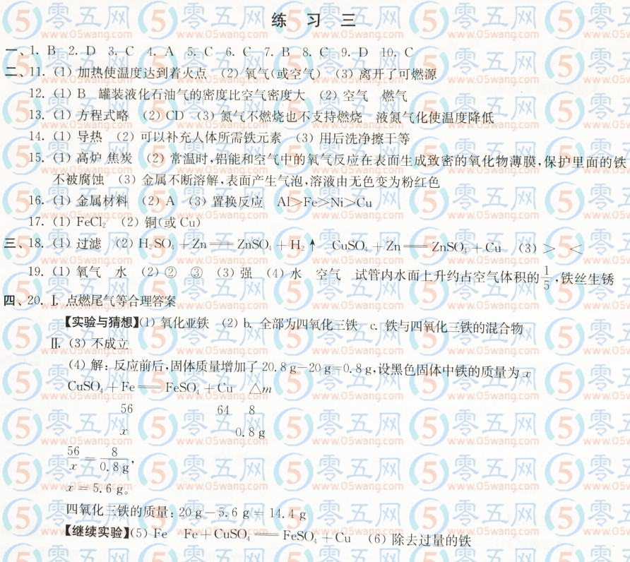 初中九年級(jí)寒假學(xué)習(xí)生活化學(xué)練習(xí)三答案