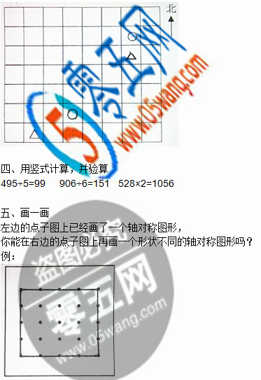 1. 把○先向南平移4格,再向西平移3格,畫出平移后的“○”?!啊稹逼揭坪笤谠瓉砦恢玫模ㄎ髂希┓较颉?br />