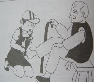 爺爺年紀(jì)大了,頭發(fā)和胡子全白了,走路顫顫巍巍的,要靠拐杖來(lái)幫忙。 這天早上,爺爺坐在板凳上想穿鞋子,但他彎不下腰,顯得很吃力。小華看見(jiàn)了,連忙走過(guò)去說(shuō):“爺爺,我來(lái)幫您穿鞋?!闭f(shuō)著,小華跪在地上,雙手拿著鞋子,套在爺爺腳上。哎喲,哎喲!慢慢地總算幫爺爺穿上了鞋子。爺爺笑瞇瞇地說(shuō):“小華,謝謝你給我穿鞋子。爺爺年紀(jì)大了,反而變成小孩子,要?jiǎng)e人幫忙了,哈哈……”小華對(duì)爺爺說(shuō):“爺爺,以前都是您幫我穿鞋子?,F(xiàn)在我長(zhǎng)大了,以后讓我來(lái)幫您吧!”“好!好!”爺爺樂(lè)得直點(diǎn)頭。 |
