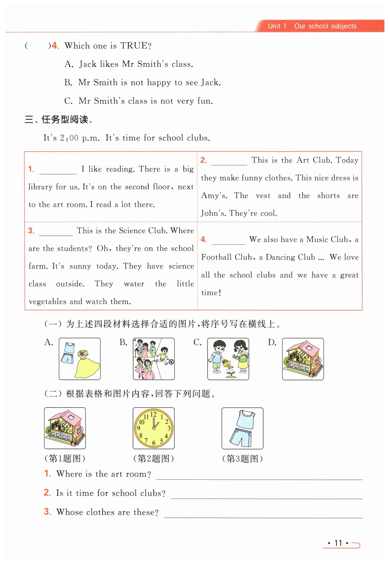 根據(jù)第四段材料We also have a Music Club, a Football Club, a Dancing Club ... We love all the school clubs and we have a great time!(我們還有一個音樂俱樂部,一個足球俱樂部,一個舞蹈俱樂部……我們喜歡所有的學校俱樂部,我們玩得很開心!) 可知,圖片B符合本段材料,故選B。