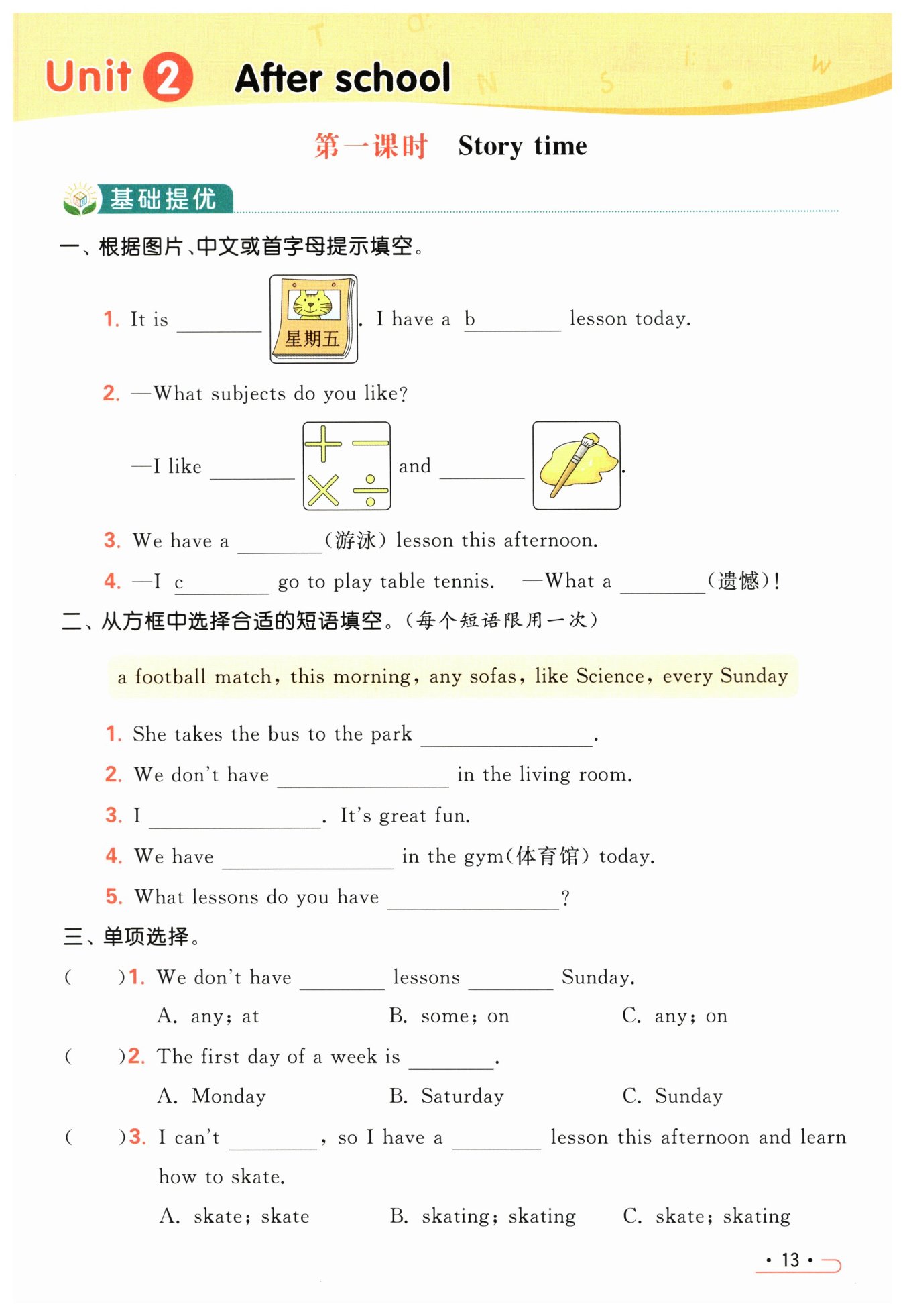 根據(jù)圖片是星期五,可知,第一空填Friday表示星期五,由lessson課,結(jié)合首字母可知,這里意思是有一節(jié)籃球課,basketball籃球,故第二空填basketball。