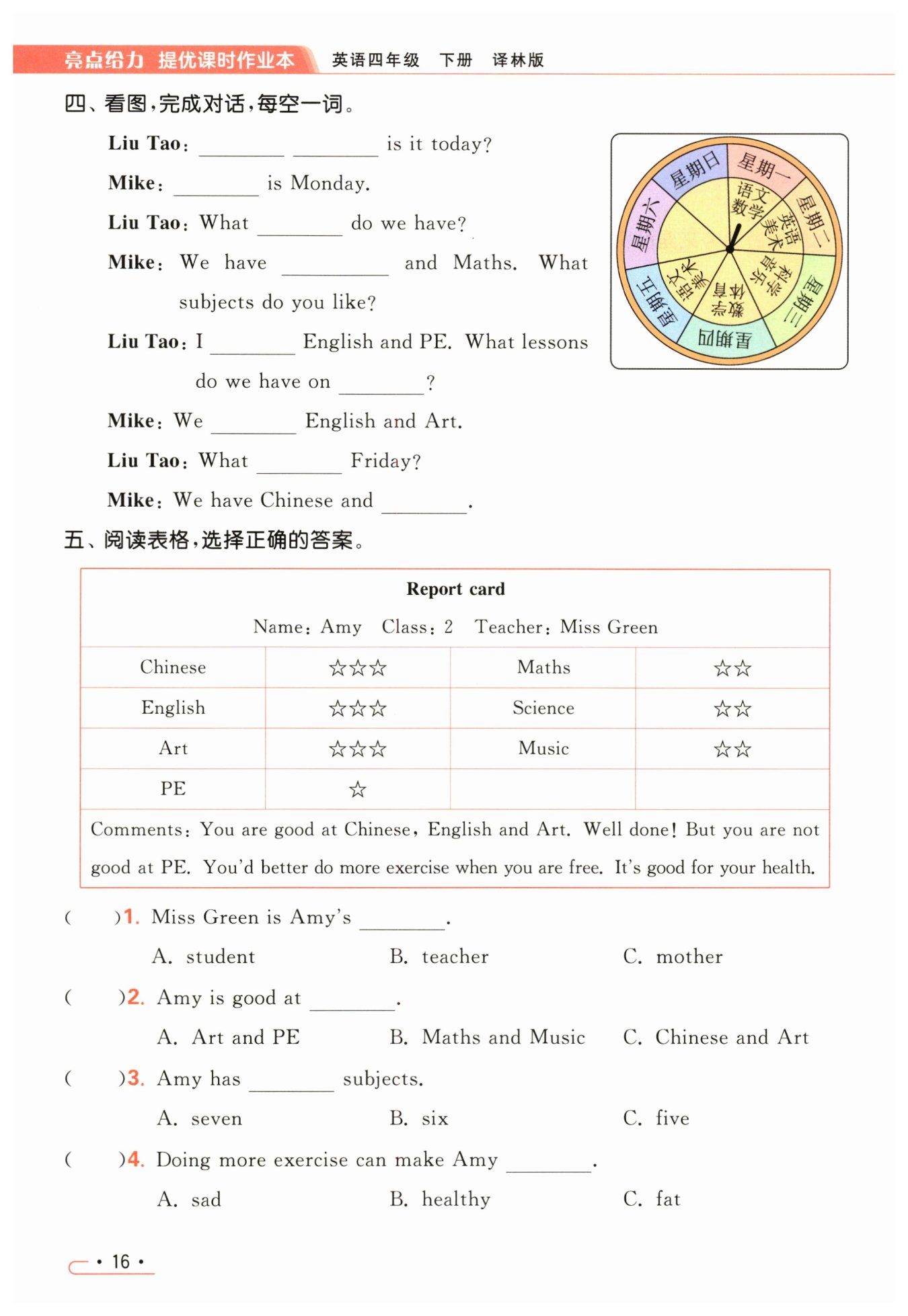 根據(jù)下句回答English and Art英語(yǔ)和美術(shù),結(jié)合圖片可知,對(duì)應(yīng)的是星期二,故填Tuesday。