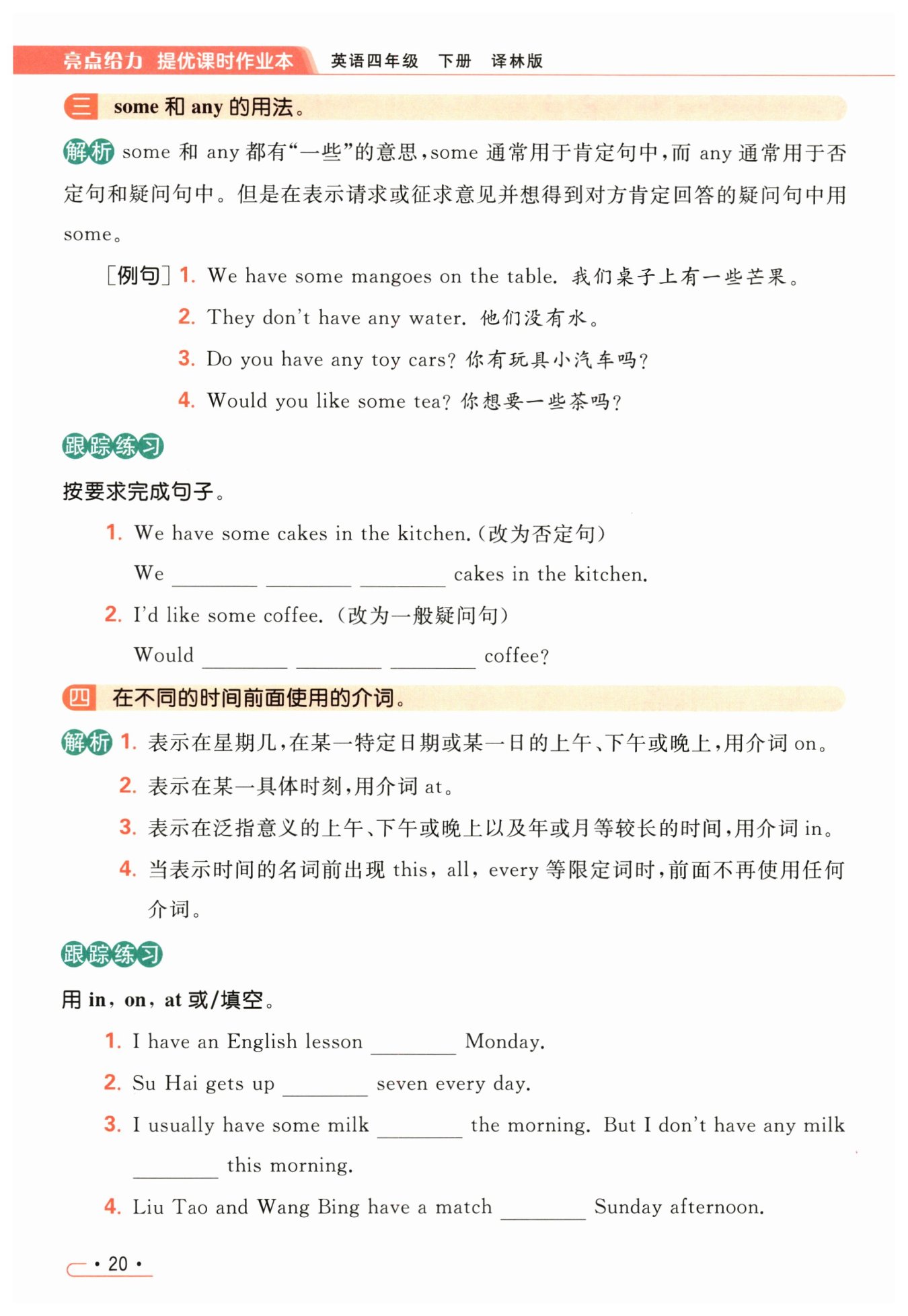 根據(jù)原句的have可知,時態(tài)為一般現(xiàn)在時,主語We為第一人稱復(fù)數(shù),改為否定句時,助動詞用don't,后跟動詞原形have,some和any都表示“一些”,any用于否定句或疑問句,some用于肯定句,故這里some改為any。故填don't have any。
