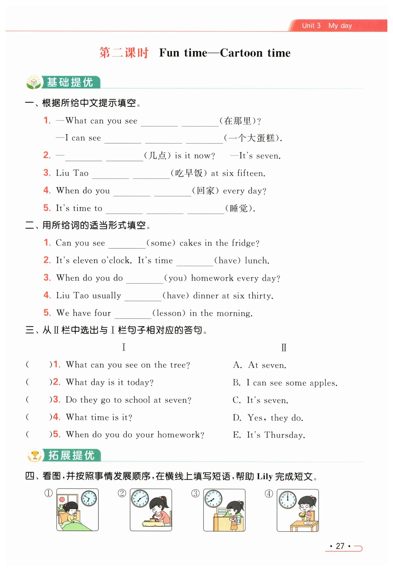 根據(jù)four ten四點(diǎn)十分,結(jié)合第五幅圖可知,在四點(diǎn)十分有一節(jié)游泳課,have a swimming lesson有一節(jié)游泳課,故填swimming lesson。