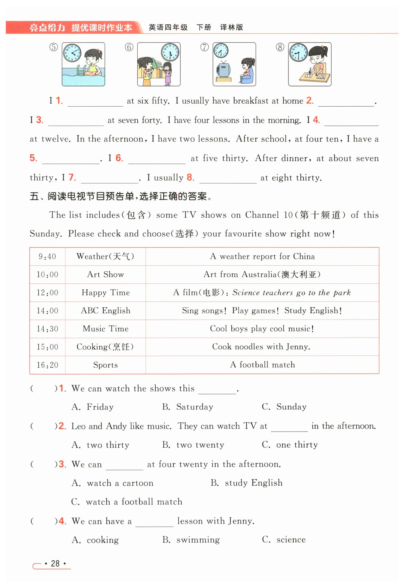根據(jù)four ten四點(diǎn)十分,結(jié)合第五幅圖可知,在四點(diǎn)十分有一節(jié)游泳課,have a swimming lesson有一節(jié)游泳課,故填swimming lesson。