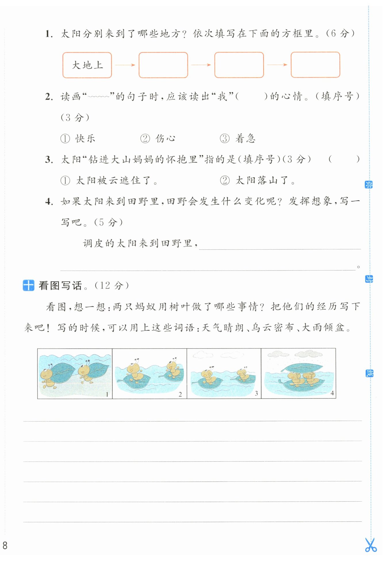 和多多急壞了。力力靈 機(jī)一動,對多多說:“快到我的船上來,你的船可以當(dāng)雨