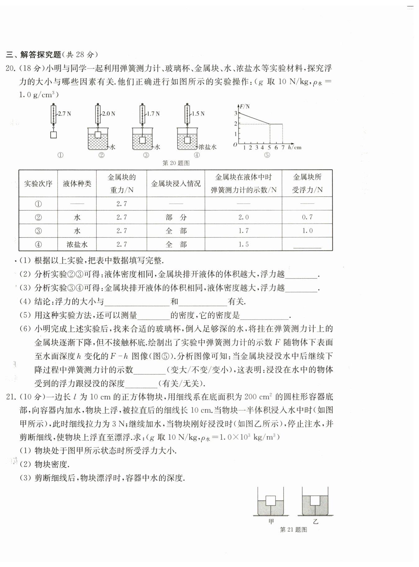 ?$?h = \frac {V-V_{排}'}{S_{容}}=\frac {1×10^{-3}\ \mathrm {m^3}-2×10^{-4}\ \mathrm {m^3}}{2×10^{-2}\ \mathrm {m^2}}=0.04\ \mathrm {m}=4\ \mathrm {cm};$?