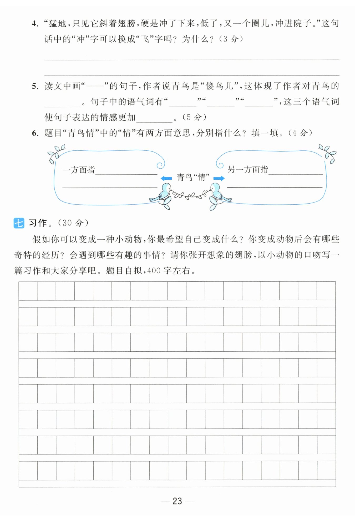 切地沖破障礙回到自己的家,表現(xiàn)出了青鳥不顧風雨,急著回家喂養(yǎng)自己孩子的心