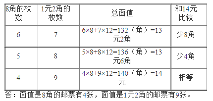 答:8角面值的郵票有4枚,1元2角的郵票有9枚。