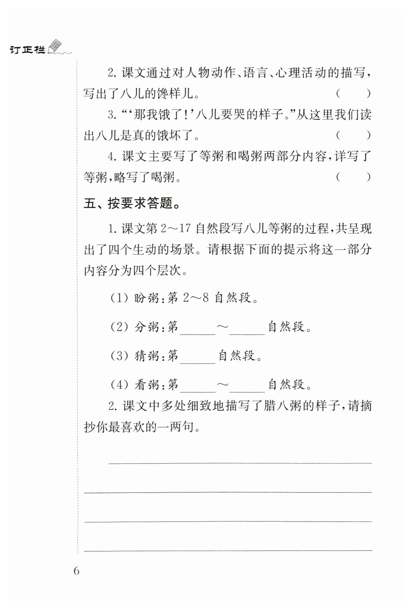 ?根據(jù)第9-12段“我要吃三碗,我們只準(zhǔn)大哥吃一碗”“要不然我吃三碗半,你就吃兩碗半”可以看出是在分粥;根據(jù)第13段“對八兒來說,只能猜想”可以看出是在猜粥;根據(jù)第14-17段“鍋中的一切已進(jìn)了他的眼”“黑的”可知是在看粥。