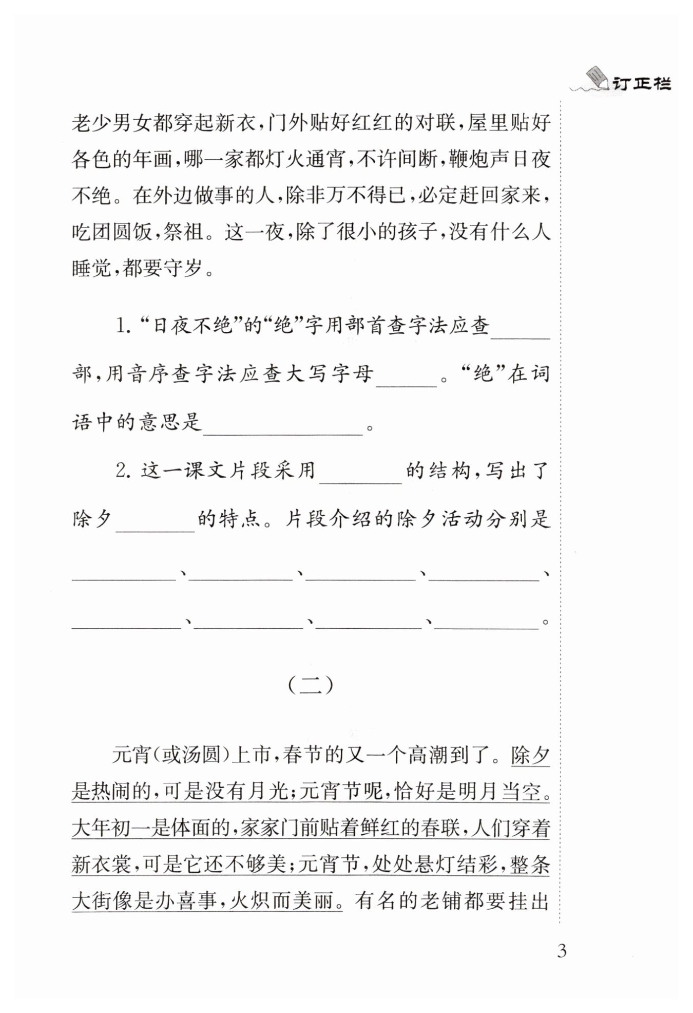 ?從第一句“除夕真熱鬧”可知,除夕的特點(diǎn)是熱鬧,結(jié)合后文的“家家趕做年菜”“老少男女都穿起新衣”“門(mén)外貼好紅紅的對(duì)聯(lián)”“屋里貼好各色的年畫(huà)”“鞭炮聲日夜不絕”“吃團(tuán)圓飯,祭祖”“都要守歲”可知,這一片段圍繞第一句話分別介紹了做年菜、穿新衣、貼對(duì)聯(lián)、貼年畫(huà)、放鞭炮、吃團(tuán)圓飯、祭祖、守歲這些除夕活動(dòng),因此這一片段采用的是“總分”的結(jié)構(gòu)。