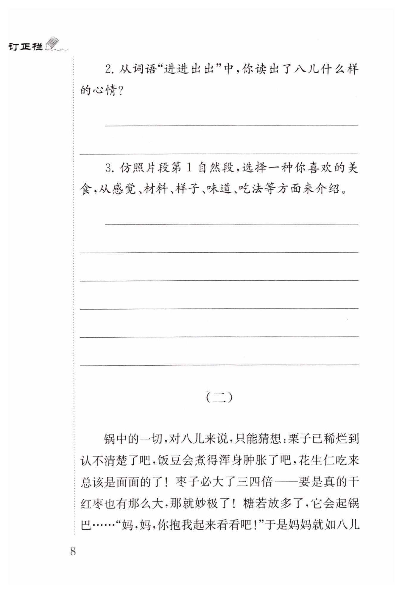 ?分析片段第1自然段第一句“……的小孩子,……的大孩子,……的老孩子”可知,這句話運(yùn)用排比的修辭手法寫(xiě)出了不同人群對(duì)臘八粥的喜愛(ài)與印象深刻;分析“讓它在鍋中嘆氣似的沸騰著”可知,這句話運(yùn)用了擬人的修辭手法,生動(dòng)形象地寫(xiě)出了臘八粥在鍋里熬煮時(shí)的情態(tài);分析“單……就……何況……”可知,這句話運(yùn)用了遞進(jìn)關(guān)系的關(guān)聯(lián)詞,進(jìn)一步說(shuō)明了臘八粥的香味以及人們對(duì)臘八粥的喜愛(ài)之情。