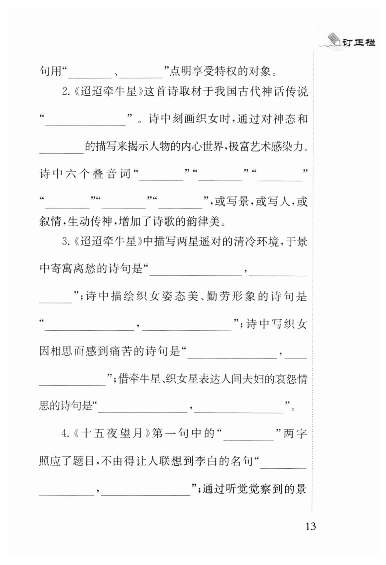 ★①抓住關(guān)鍵詞句“兩星遙對(duì)的清冷環(huán)境”“于景中寄寓離愁”,可對(duì)應(yīng)原文“迢迢牽牛星,皎皎河漢女”,意思是在銀河?xùn)|南牽牛星遙遙可見(jiàn),在銀河之西織女星明亮皎潔。