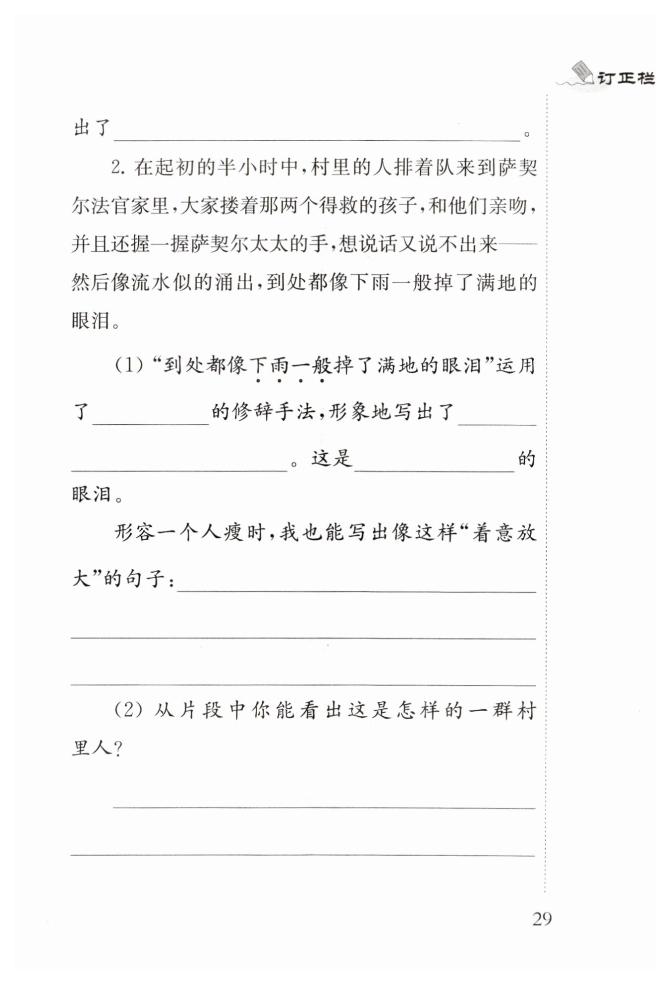 ?這句話用“下雨”來形容眼淚,結合生活常識可知,下雨時雨十分密,十分多,這里用來形容眼淚,是運用了夸張的修辭手法,夸大淚多,再結合上文“摟著兩個得救的孩子”“想說話又說不出來”可知,看到兩個孩子安全歸來,村里的人心情十分激動、喜悅。