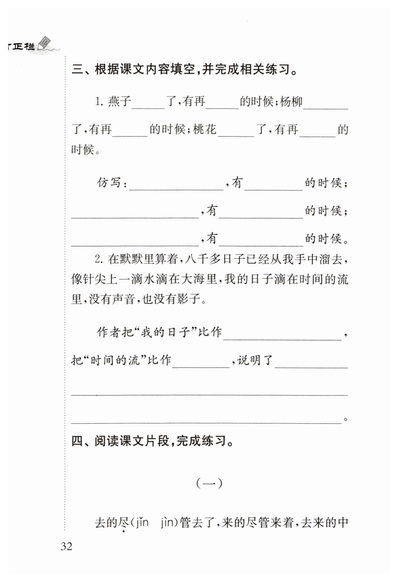 ?根據(jù)文中原句“燕子去了,有再來的時候;楊柳枯了,有再青的時候;桃花謝了,有再開的時候?!碧顚?。仿寫時注意句式“……了,有再……的時候”以及所填部分的字詞意思相反“去——來”“枯——青”“謝——開”,語句通順,語言優(yōu)美即可。