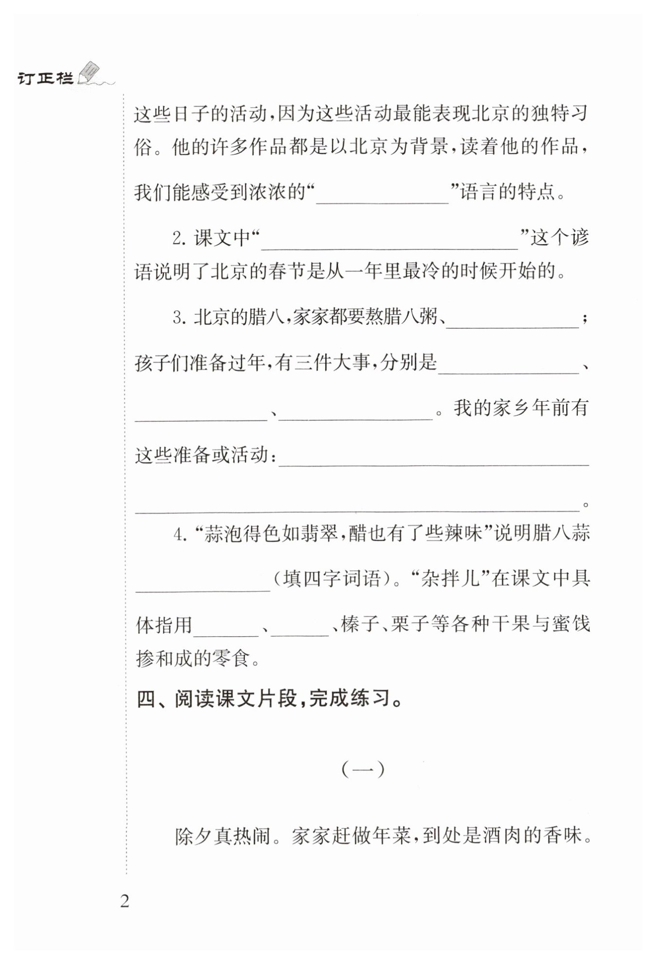 ★ 其中第1、2段詳細(xì)介紹了臘八熬臘八粥、泡臘八蒜的習(xí)俗;第6段詳細(xì)介紹了臘月二十三人們祭灶王的情形;第8段詳細(xì)介紹了做、吃年夜飯,祭祖等除夕時(shí)的習(xí)俗;第9、10段詳細(xì)介紹了人們拜年、逛廟會(huì)等正月初一時(shí)的習(xí)俗;第12、13段詳細(xì)介紹了正月十五元宵節(jié)玩花燈等熱鬧場(chǎng)面:以上都是作者著重詳寫的內(nèi)容。