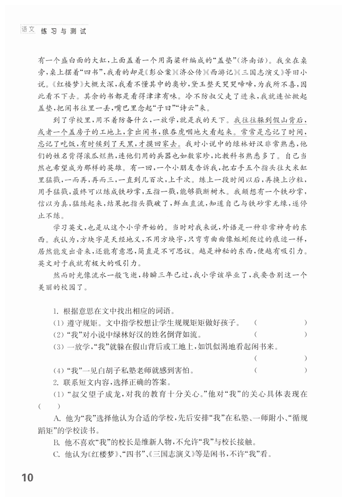 ?第(1)題,文章第2段點明“叔父望子成龍,對我的教育十分關(guān)心?!苯又鴮懯甯赴才拧拔摇痹谒桔永飳W(xué)習(xí),又把“我”送到一師附小去念書。這就是叔父對“我”教育上關(guān)心的體現(xiàn),A正確。B、C都是叔父自身觀念的體現(xiàn),用自己的觀點來干擾“我”的生活、選擇,不是對“我”教育上關(guān)心的表現(xiàn)。