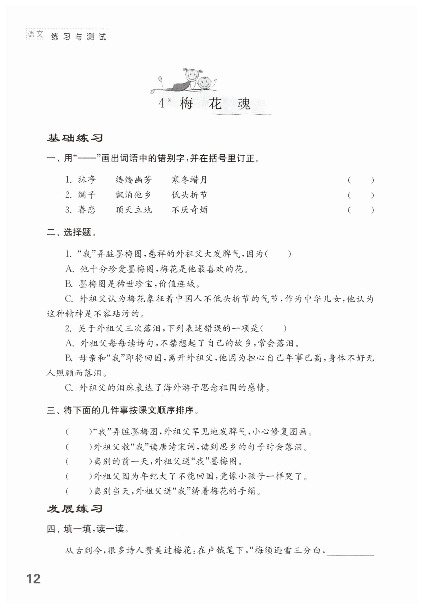 ④由第12段“離別的前一天早上,外祖父早早地起了床,把我叫到書(shū)房里鄭重地遞給我一卷白杭綢包著的東西。我打開(kāi)一看,原來(lái)是那幅墨梅圖”可知,接著寫(xiě)了離別的前一天,外祖父送“我”墨梅圖,因此第3句排在4;