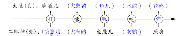 對(duì)照原文內(nèi)容,篩選出大圣與二郎神斗智斗法的過(guò)程,由原文內(nèi)容可知,齊天大圣孫悟空先是變作麻雀兒,二郎神變作餓鷹去撲打他,大圣隨即變作大鶿老,二郎神變作大海鶴去嗛他,大圣又變成魚兒,二郎神變作魚鷹兒去啄他,大圣變作水蛇,二郎神變作灰鶴去吃他,大圣又變作花鴇,二郎神現(xiàn)出原身,一彈弓將他打了下來(lái)。