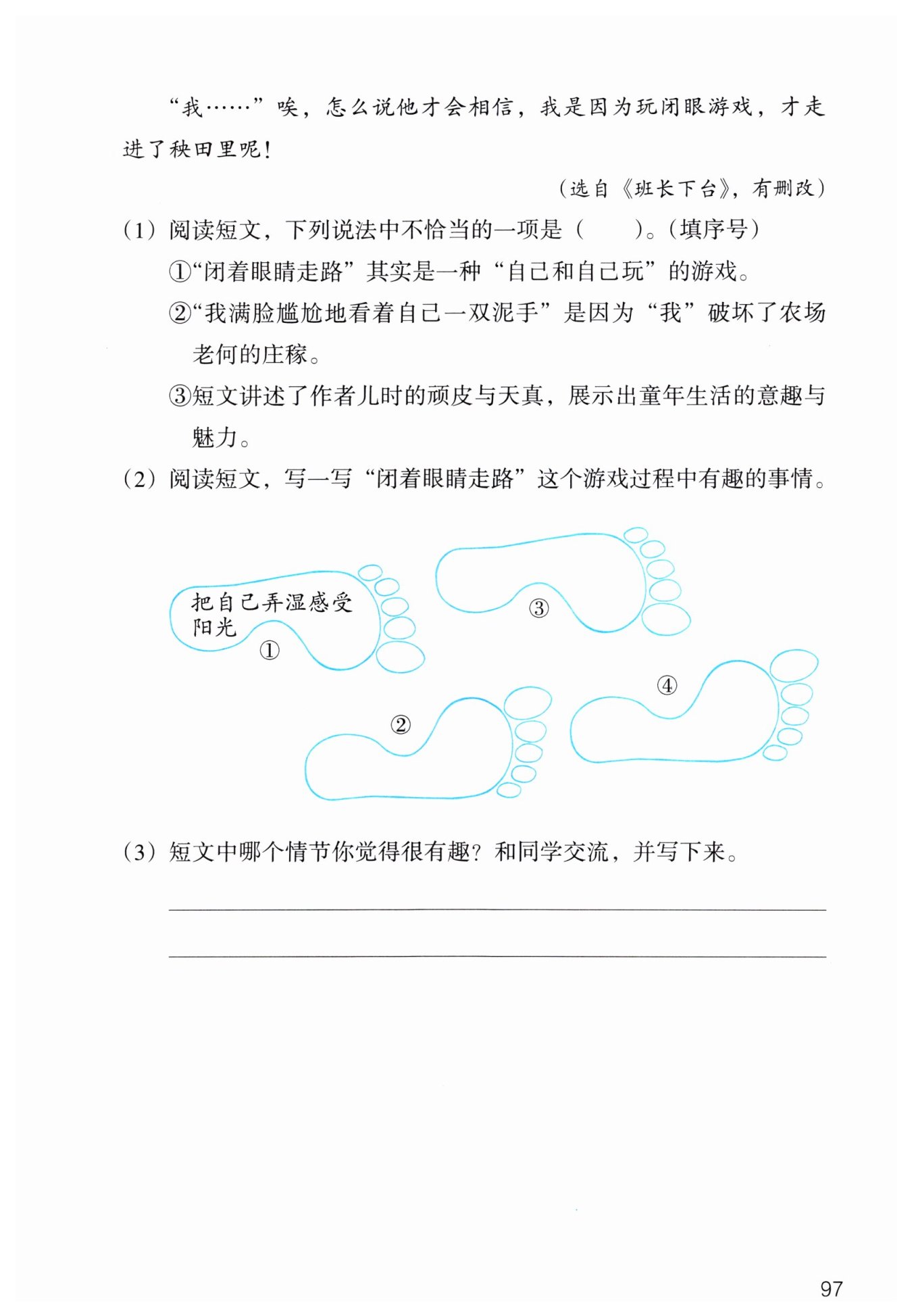 ③通讀全文,由“小時候,我最喜歡做一些‘自己和自己玩’的游戲”,“我仰著臉,閉著眼,讓太陽暖烘烘地曬著......我覺得自己快要跌倒了,趕快睜開眼睛,哈!直直的一條路,我走歪了”“我假裝自己正走著高空鋼索......”等語句可以看出作者兒時的頑皮與天真,文章展示了作者童年生活的意趣與魅力。③正確。