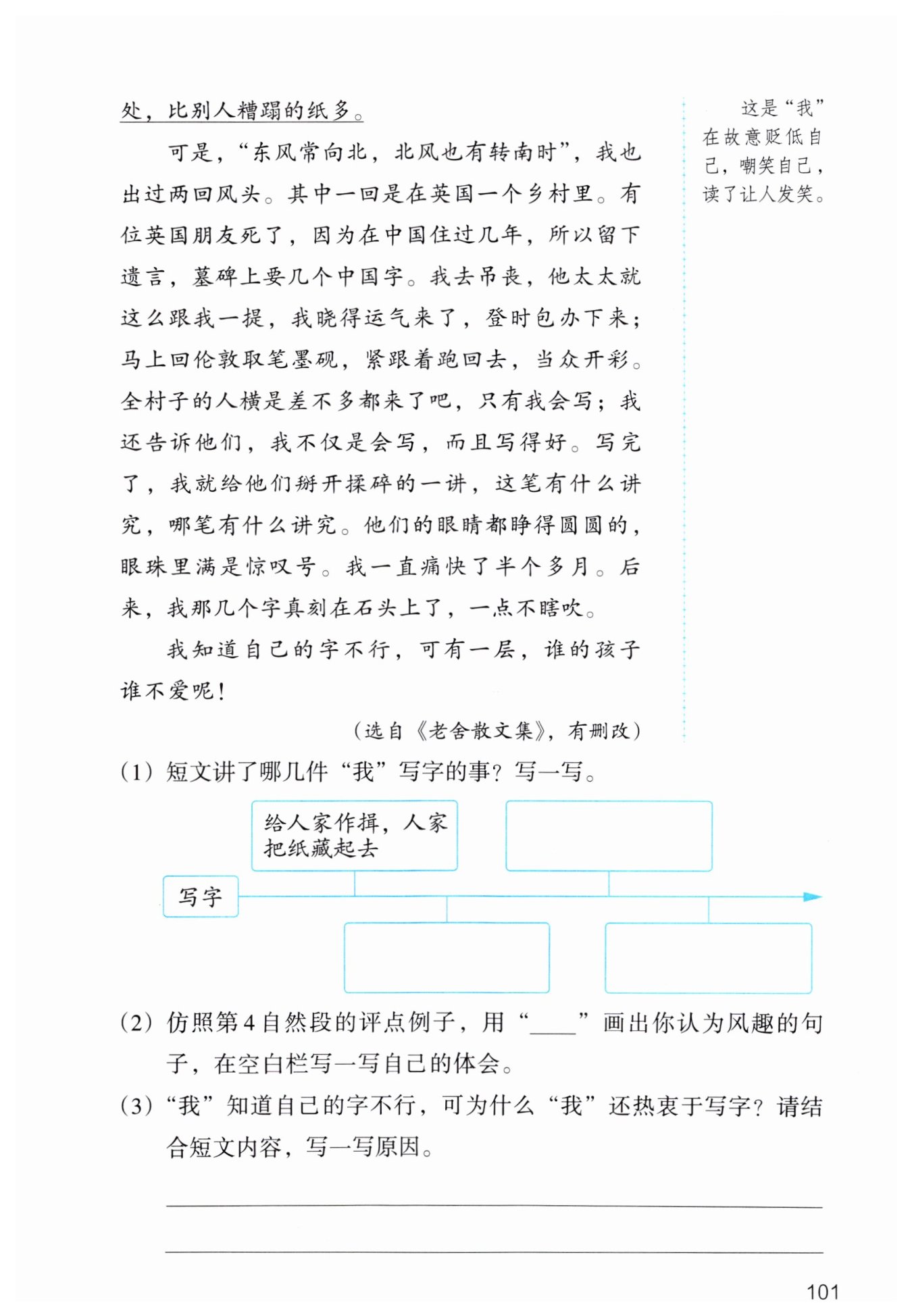 ?開放題,沒有唯一的答案,可以自己畫出認為風趣的句子,然后寫上自己的體會。這里以“我知道自己的字不行,可有一層,誰的孩子誰不愛呢!”為例進行評點,這句話同樣風趣幽默,作者將自己的字比作自己的孩子,可見作者對自己的字有多么喜愛,但是他還要謙虛一下,說“知道自己的字不行”,十分風趣。