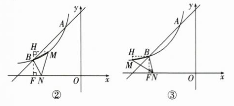 $①當M在B點右側時,過點B作BF⊥ x軸于點F,過點M作MH⊥BF,交FB的延長線于點H,如圖②.$