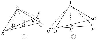 $解:(2)如圖①,過(guò)點(diǎn) A 作 A H \perp B P 于點(diǎn) H,$
