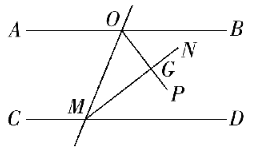 $解:如圖,已知AB//CD,OP、MN分別平分∠BOM、∠OMD$ $OP、MN交于點(diǎn)G$ $求證:MN⊥OP$ $證明:∵AB//CD$ $∴∠BOM+∠OMD=180°(兩直線平行,同旁內(nèi)角互補(bǔ))$ $∵OP、MN分別平分∠BOM、∠OMD$ $∴2∠POM+2∠NMO=180°$ $∴∠POM+∠GMO=90°$ $∴∠MGO=90°$ $∴MN⊥OP.$