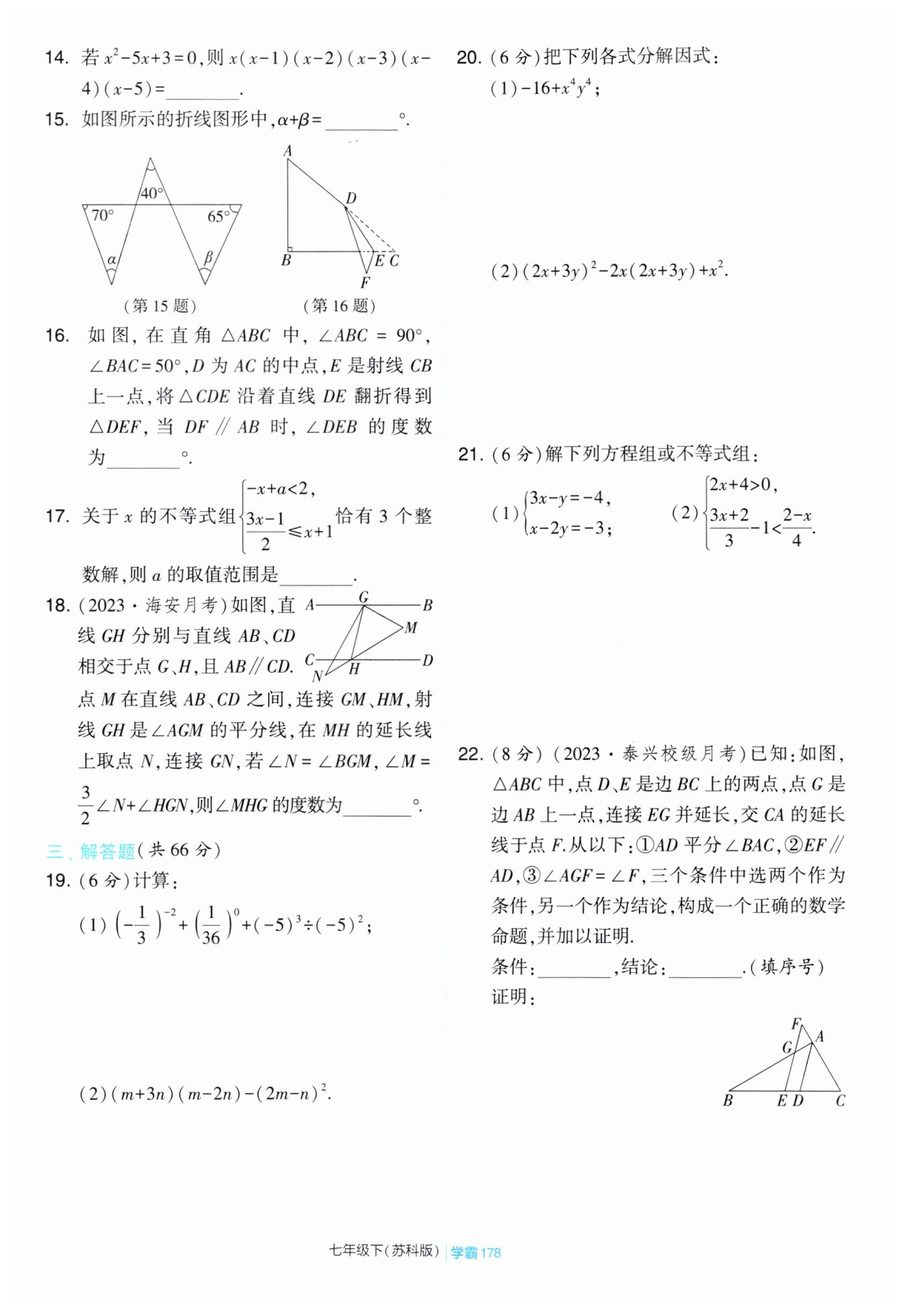 $解:(1) ①×2-②可得5x=-5,解得x=-1$