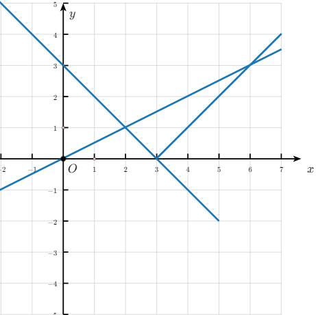 $得\begin{cases}{ y=-x+3 }\ \\ {y=\frac12x\ } \end{cases}\ $