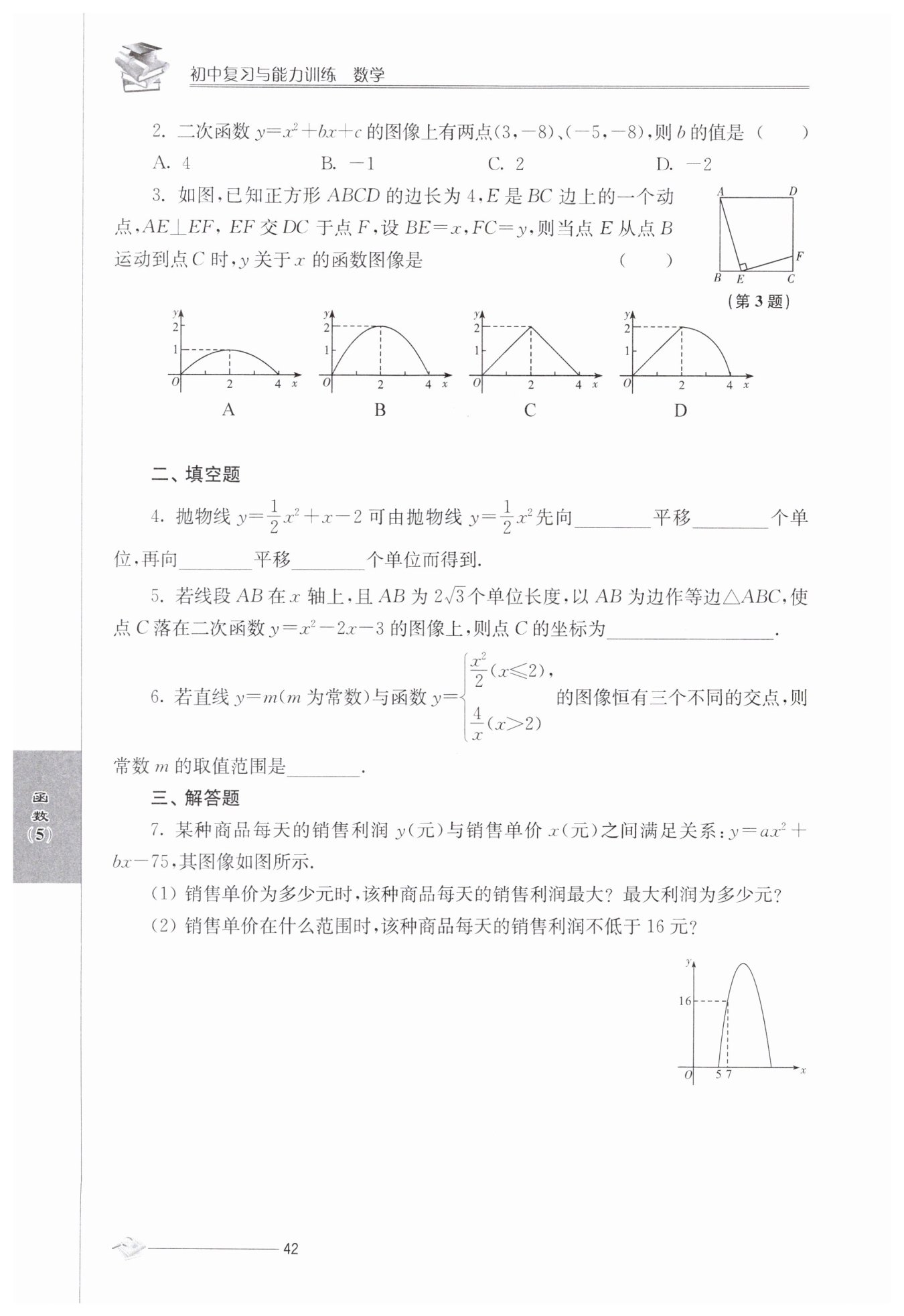 $解:(1)將(5,0)和(7,16)代入y=ax^2+bx-75$ $解得a=-1,b=20$ $y=-x^2+20x-75$ $=-(x-10)^2+25$ $當x=10時,y最大值為25$ $答:銷售單價為10元時,每天的銷售$ $利潤最大為25元。$ $(2)將y=16代入y=-x^2+20x-74$ $解得x=7或13,$ $∴7<x<13時y>16$ $答:單價在7至13元時,每天銷售利潤$ $不低于16元。$