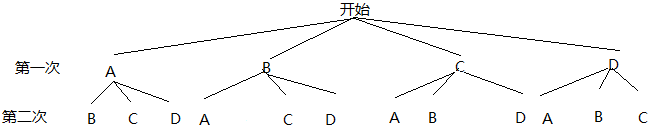 $共有12種等可能結(jié)果,其中有AD、BC、CB、DA四種結(jié)果滿足題意$