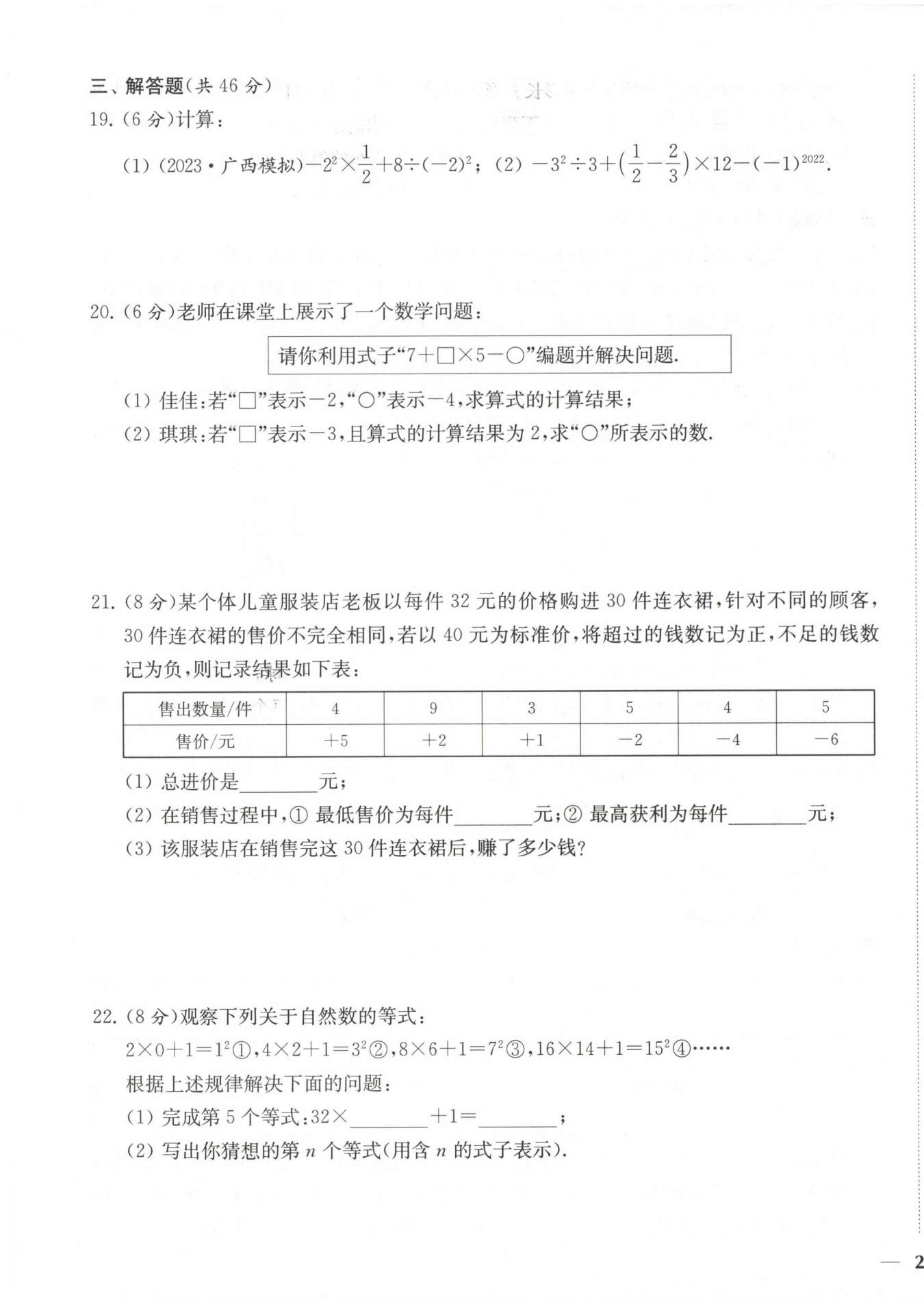 $(2)7+(-3)×5-○=2,即7-15-○=2$