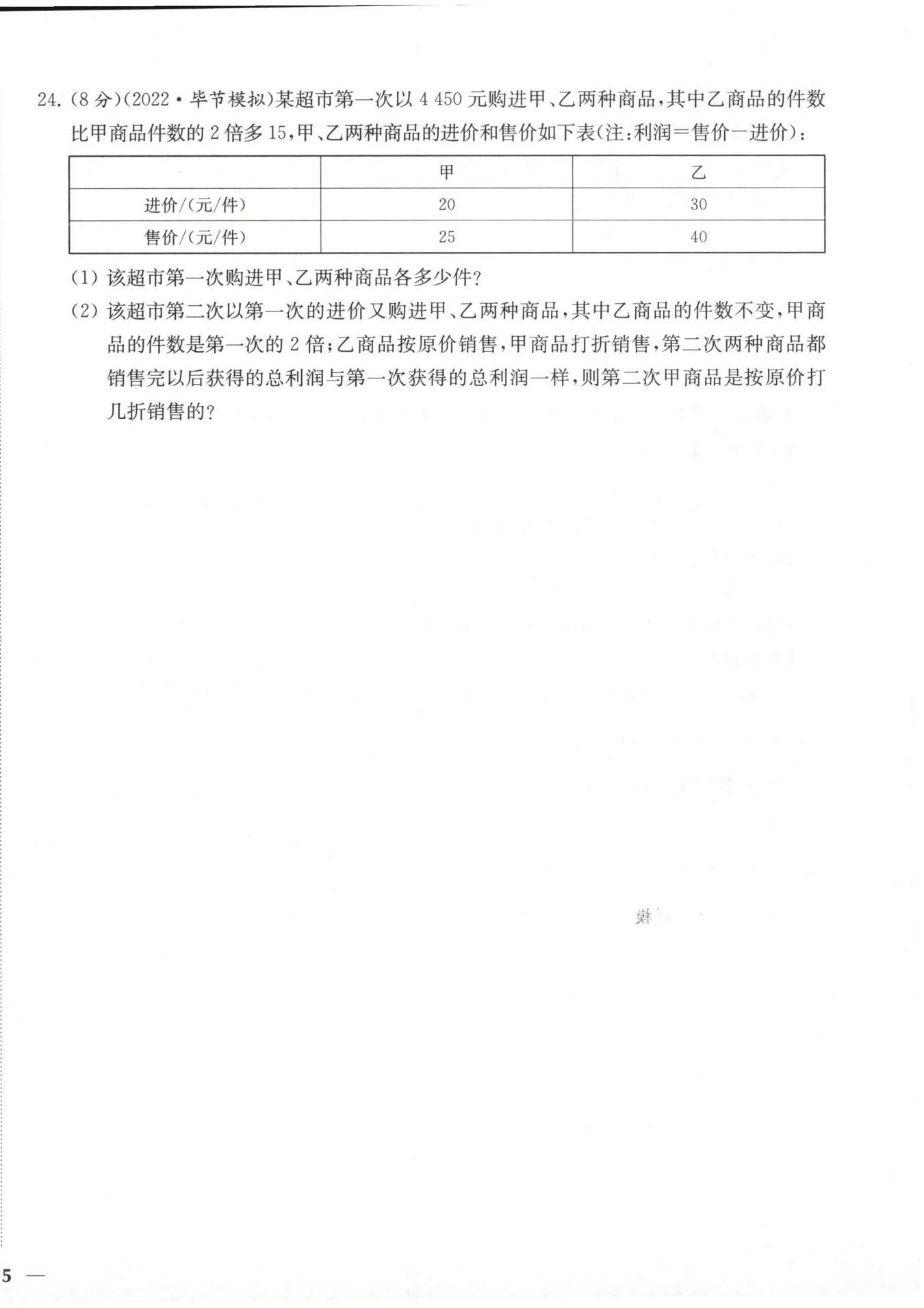 $解:(1)設(shè)第一次購(gòu)進(jìn)甲種商品x件,則購(gòu)進(jìn)乙種商品(2x+15)件$