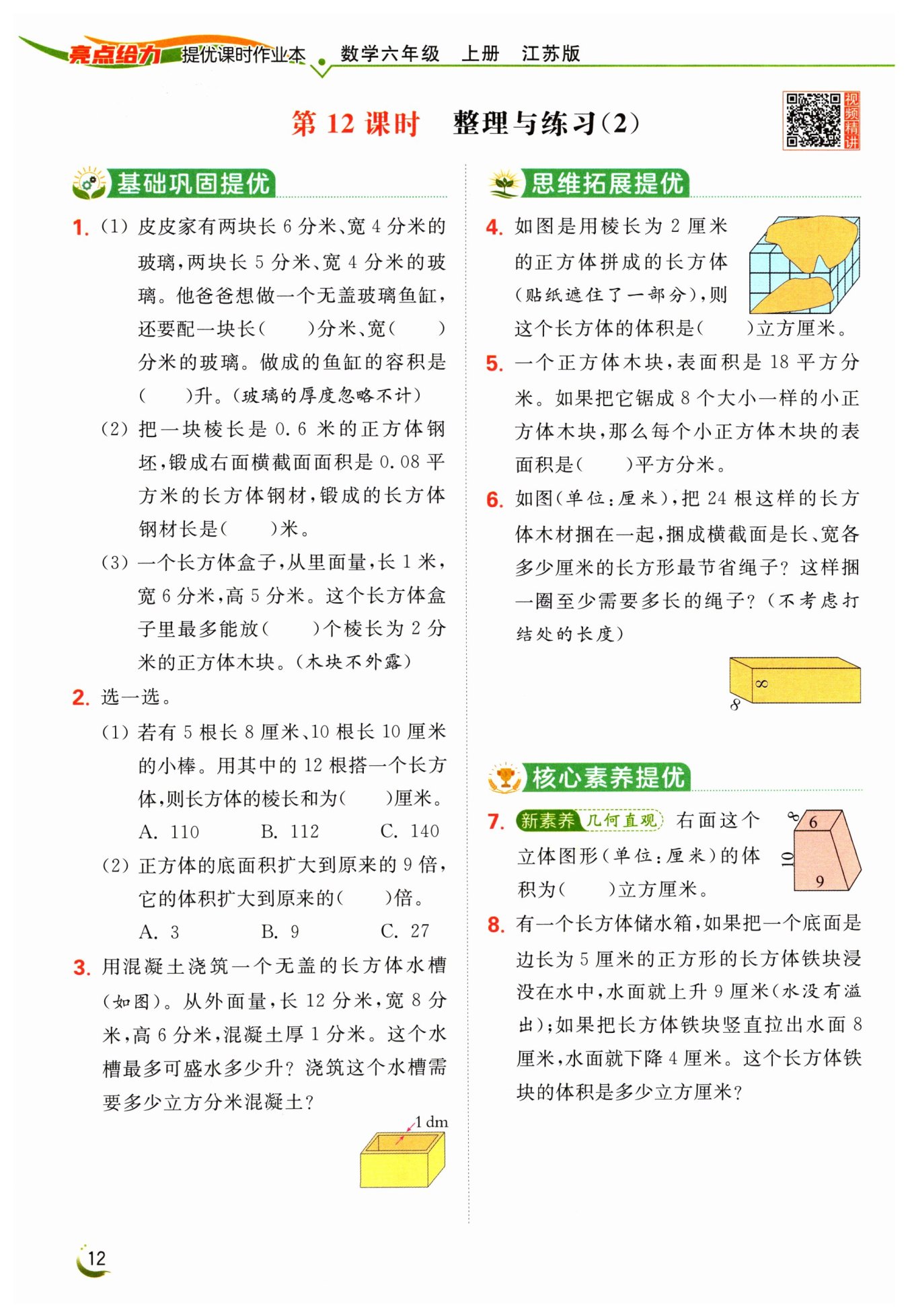 $混凝土:12×8×6-300=276(立方分米)$