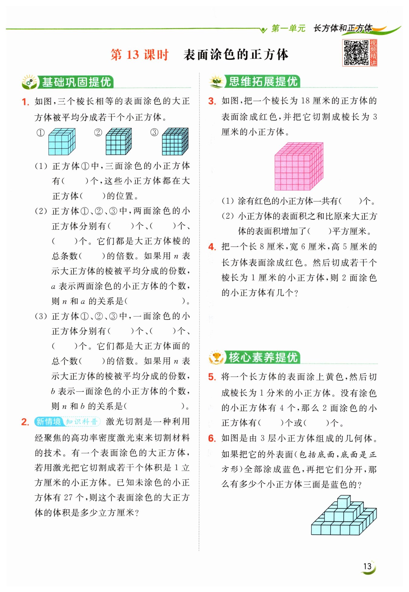 $答:則2面涂色的小正方體有52個(gè)。$