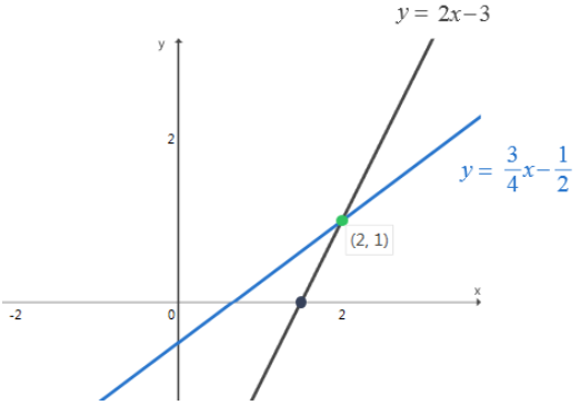 解:原方程組可轉(zhuǎn)化為 $\left\{ \begin{array}{l}{y=2x-3} \\ {y=\frac34x-\frac12} \end{array} \right.$