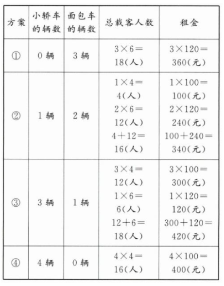 答:租1輛小轎車和2輛面包車最合算,需要340元租金。