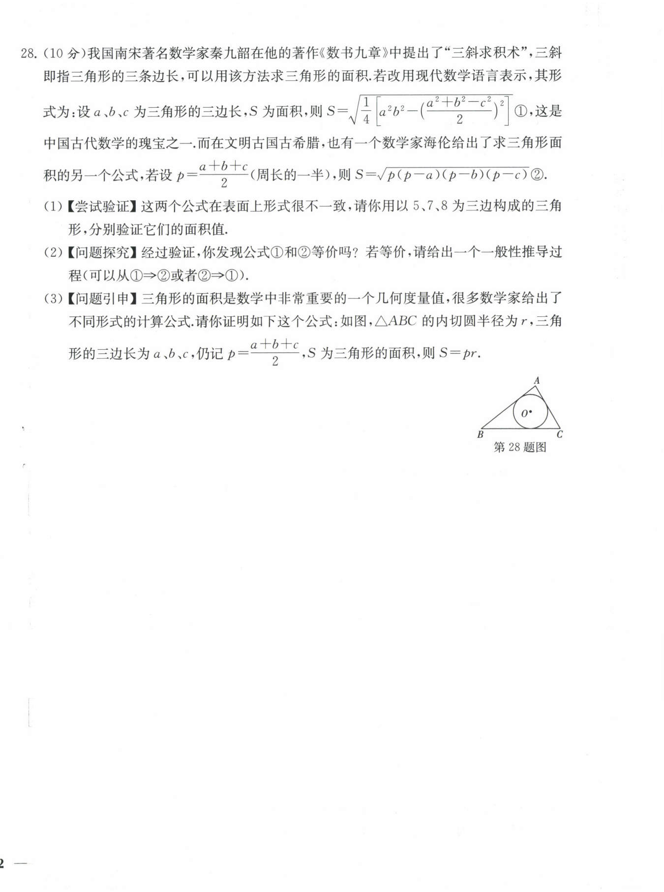 $∴\sqrt{\frac {1}{4}[ a^2b^2-(\frac {a^2+b^2-c^2}{2})^2]}=\sqrt{p(p-a)(p-b)(p-c)}.$