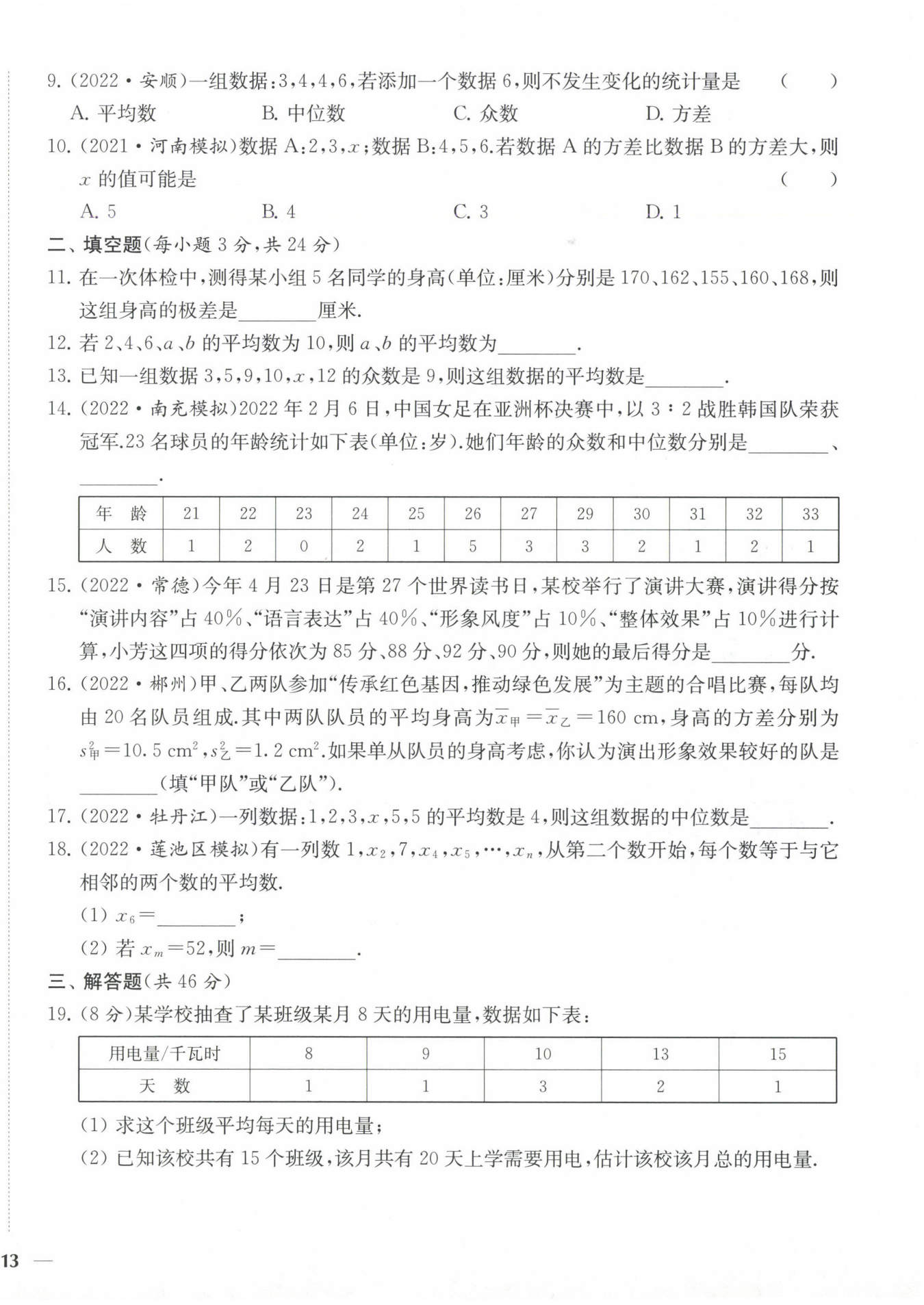 $解:(1) 平均用電量為 (8+9+10 \times 3+13 \times 2+15) \div 8=11 (千瓦時), $
