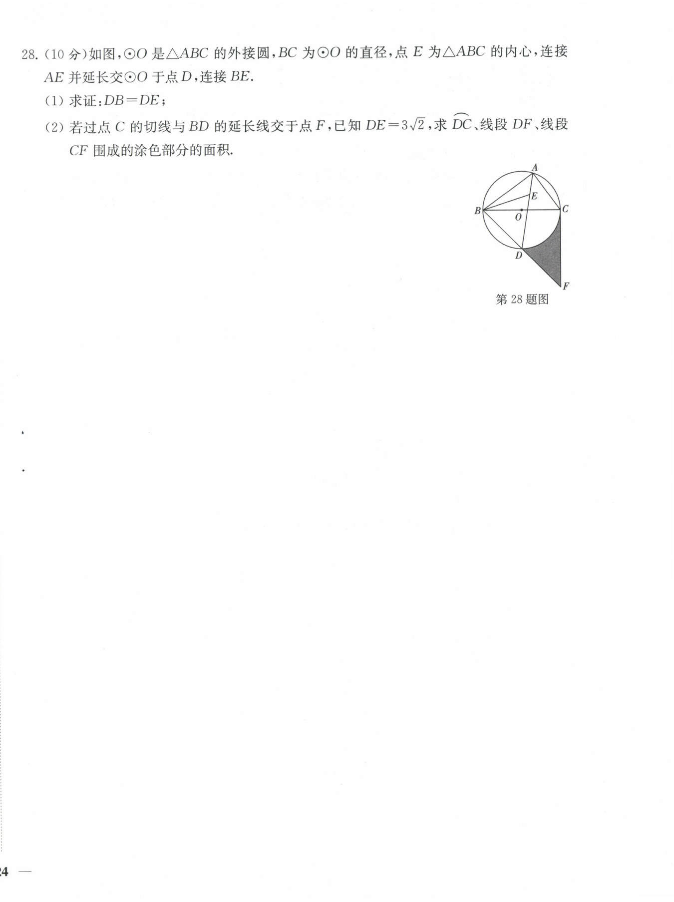 $\therefore S_{涂色 }=S_{\triangle C D F}-(S_{扇形 O C D}-S_{\triangle O C D})=\frac {1}{2} \times 3 \sqrt{2} \times 3 \sqrt{2}-(\frac {90 \cdot \pi \cdot 3^2}{360}-\frac {1}{2} \times 3 \times 3)=\frac {27}{2}-\frac {9 \pi}{4}$