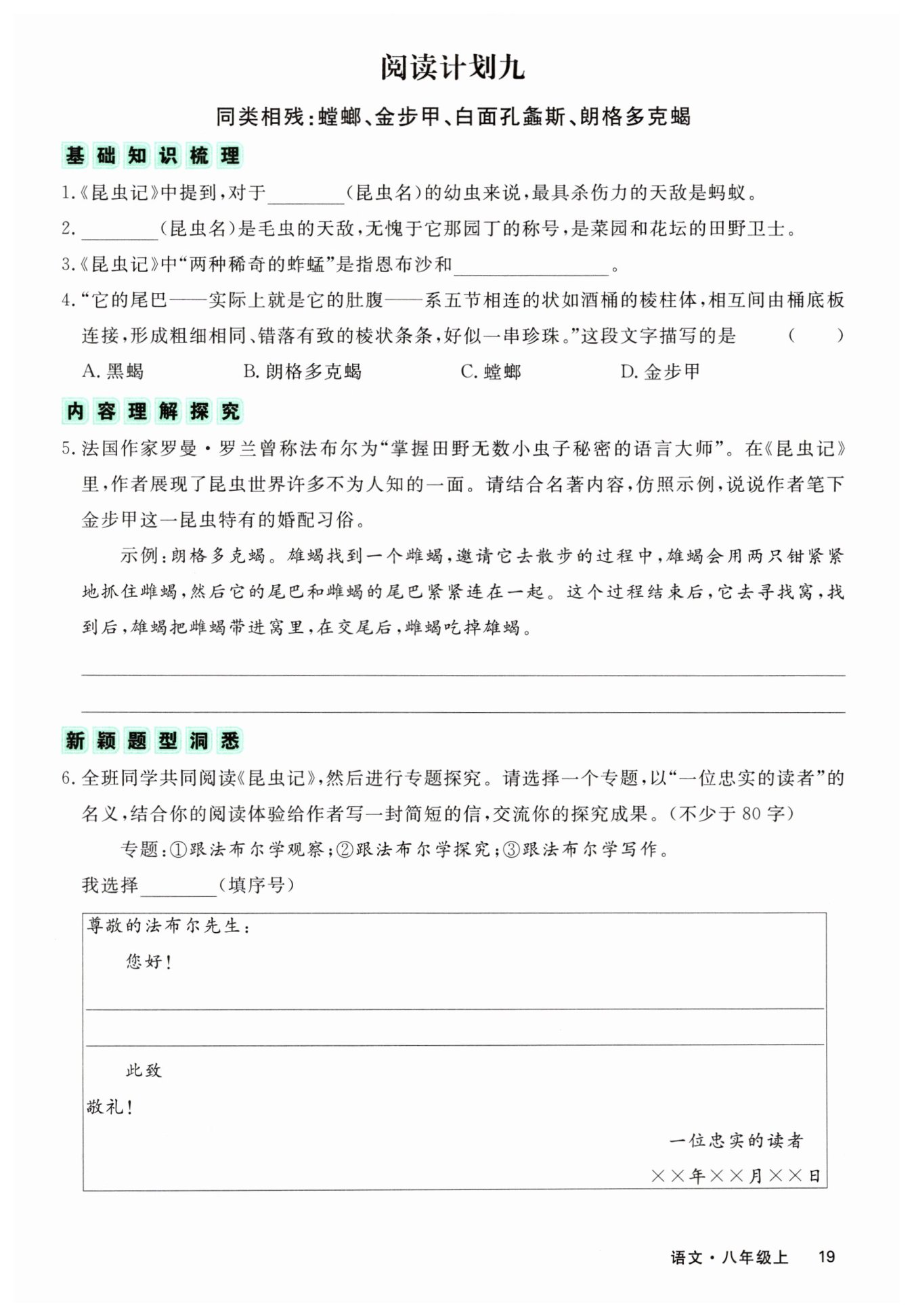 示例:① 讀了《昆蟲記》,我感覺昆蟲世界多彩迷人,科學探索并不枯燥。不同于其他昆蟲學家,您多用野外觀察和實驗的方法來研究昆蟲。為了了解昆蟲的生命歷程,您長時間追蹤觀察昆蟲,為我們揭開了昆蟲世界的一個個奧秘。您發(fā)現(xiàn)了蟬在地下“潛伏”四年才鉆出地面,切葉蜂不用任何工具就能精確地“剪裁”,螳螂善用“心理戰(zhàn)術”制服敵人……您研究昆蟲時的觀察方法讓我深受啟發(fā)。謝謝您,法布爾先生!