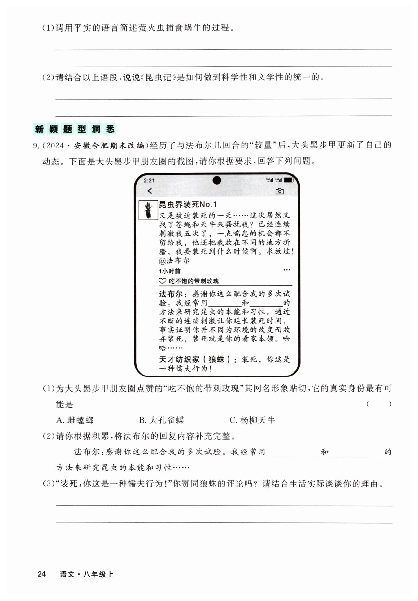 《昆蟲記》不僅是科學(xué)著作,也是文學(xué)巨著。如語段中寫螢火蟲捕食蝸?!熬秃孟窈臀伵6褐妗薄安换挪幻τ袟l不紊地扭著”,運(yùn)用擬人的修辭手法,把螢火蟲緊張的捕食過程寫得活潑有趣,使讀者在輕松閱讀中既了解了昆蟲習(xí)性,又體會(huì)到了文學(xué)的美感。