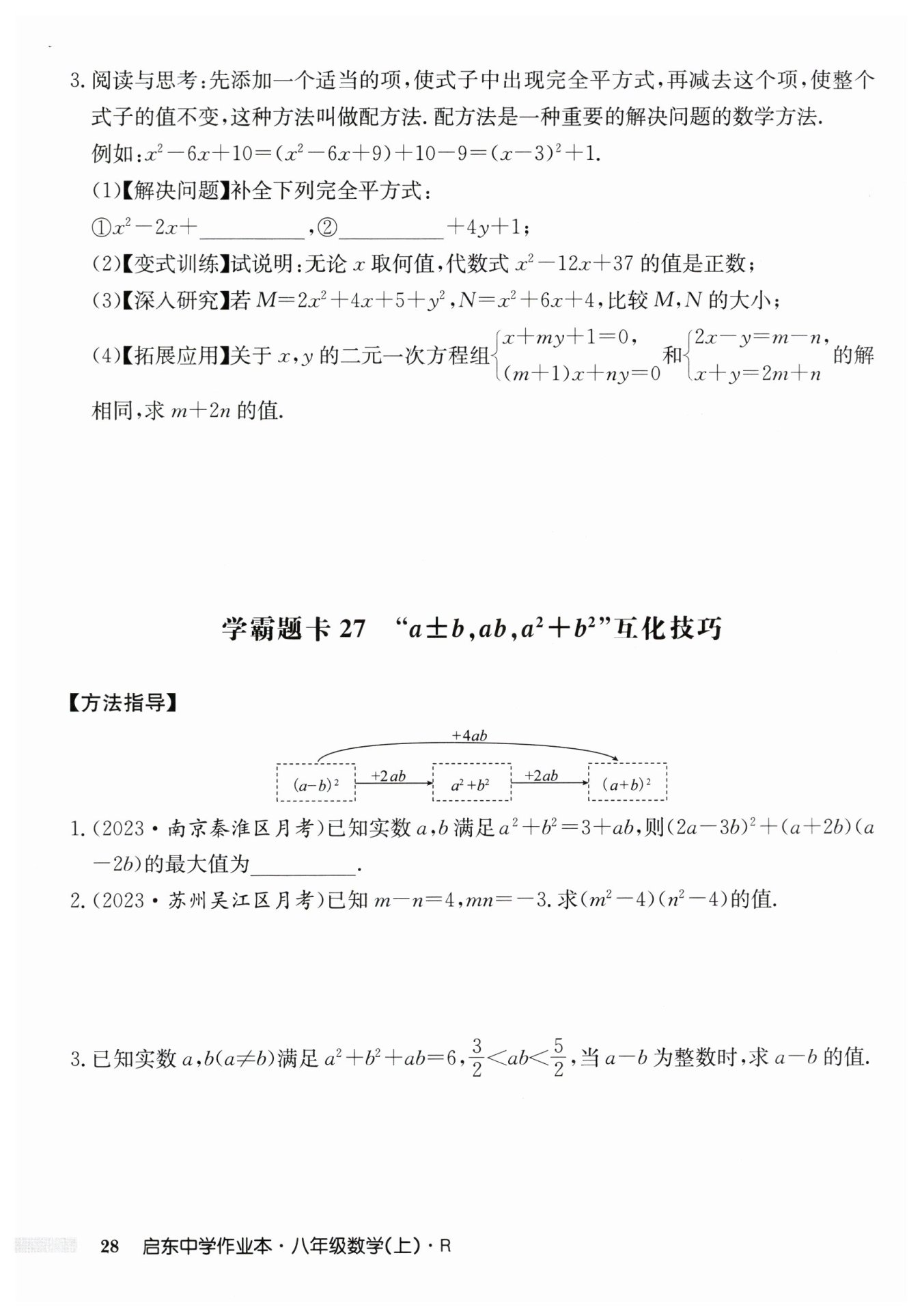 $(2)解:M-N=(2x^{2}+4x+5+y^{2})-(x^{2}+6x+4)=x^{2}-2x+1+y^{2}=(x-1)^{2}+y^{2}$